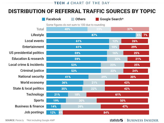 Casi todo el tráfico de contenido escrito proviene de Google o Facebook. El resto de las fuentes de tráfico combinadas ni siquiera se acercan a competir con esos dos Goliat.